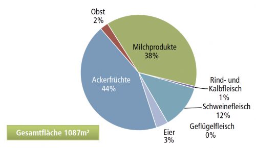 • Durch mehr Ackerfrüchte und die Reduktion von tierischen Produkten könnte diese Fläche theoretisch auf knapp 1100m² reduziert werden.