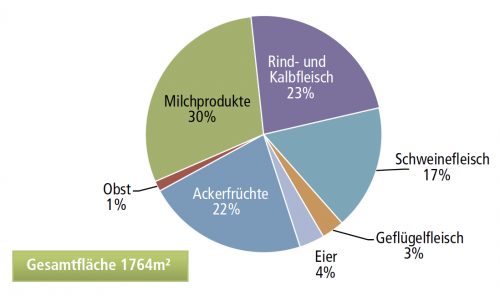 • Eine Person aus der Schweiz benötigt heute mit ihrem durchschnittlichen Essverhalten eine landwirtschaftliche Nutzfläche von ca. 1800m² (ausgenommen sind dabei Getränke).